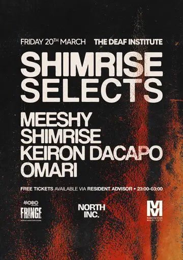 SHIMRISE SELECTS takes place at The Deaf Institute in Manchester, United Kingdom on March 20, 2026. Featuring Omari, Shimrise, Meeshy. Tech House, Deep House.