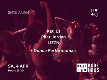 Badehaus Berlin in Berlin, Germany presents SHINE A LIGHT x HOUSE QUEENS 2026, a curated electronic music experience on Saturday, April 4, 2026, featuring Pilar Jordan, LIZZN, Kat_Es and 0 more artists. This event brings together artists and fans who share a passion for dance music culture and House sounds.