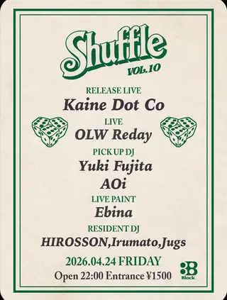Shuffle vol.10 takes place at 88block in Tokyo, Japan on April 24, 2026. House and Bass sounds all night.