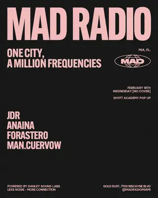SHYFT ACADEMY POP UP: JDR, ANAINA, FORASTERO, MAN.CUERVOW takes place at Mad Radio Miami in Detroit, United States on February 18, 2026. House sounds all night.