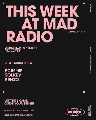 SHYFT RADIO SHOW: SCIMMIE, SOLKEY, RENZO on April 8, 2026 at Mad Radio Miami, Miami features electronic music performances DJ sets.