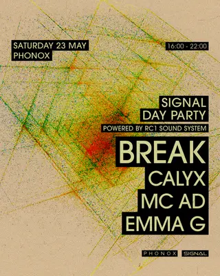 Signal Day Party: Break, Calyx, Emma G, MC AD - Powered by RC1 Sound System takes place at Phonox in London, United Kingdom on May 23, 2026. Featuring Break, Calyx, DJ Emma G. Drum & Bass and Jungle sounds all night.