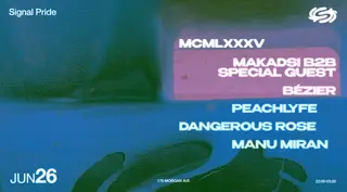 Signal Pride:MCMLXXXV, Makadsi B2B Special Guest, Beziér, Peachlyfe, Dangerous Rose, Manu Miran on June 26, 2026 at Signal, New York City features MCMLXXXV, Makadsi, Special Guest (US), Bézier, Peachlyfe, Rosa Peligrosa and Manu Miran performing DJ sets.