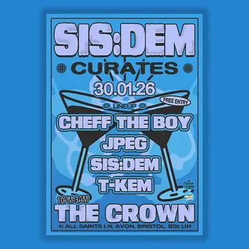 Bristol-based collective SIS:DEM return to The Crown for another edition of their 'Curates' series, bringing along Cheff The Boy, JPEG and T-Kem for all things Jungle, Footworks, Breaks + more! [A-Z] CHEFF THE BOY JPEG SIS:DEM T-KEM Free entry all night - no tickets needed. Entry requirements: 18+