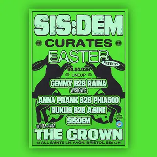 SIS:DEM Curates Easter: Gemmy B2B Raina, Anna Prank B2B Phia500 + more takes place at The Crown in Bristol, United Kingdom on April 4, 2026. Featuring Phia500, Gemmy, Rukus (2), A:sine and 1 more. Dubstep and Jungle sounds all night.