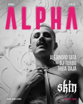 Skin ALPHA: Alejandro Gata + DJ TURBO + Theia Daja takes place at Skin in Madrid, Spain on May 22, 2026. Featuring Alejandro Gata, DJ TURBO, Theia Daja.