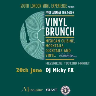 SLVE Vinyl Brunch w/ DJ Micky FX takes place at Mezzanine - Tooting in London, United Kingdom on June 20, 2026. Disco and Funk / Soul sounds all night.