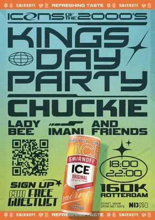 SMIRNOFF ICE PRESENTS ICONS OF THE 2000s KINGS DAY PARTY takes place at 160k in Rotterdam, Netherlands on April 27, 2026. House and Hip-Hop sounds all night.