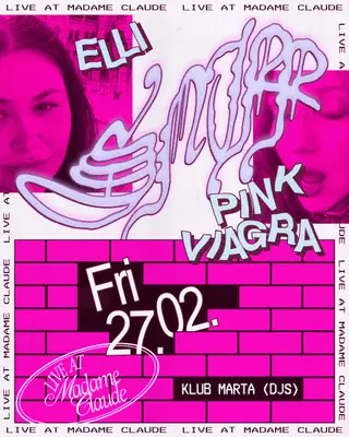 Set at Madame Claude, SNUFF: ELLI + PINK VIAGRA with DJs KLUB MARTA 2026 brings together artists and fans in Berlin on Friday, February 27, 2026. This event brings together artists and fans who share a passion for dance music culture and Hip-Hop, R&B sounds. Madame Claude has hosted Hip-Hop events in Berlin as part of the area's regular club programming. It draws fans seeking authentic Hip-Hop music in Berlin. Designed for a discerning audience, Madame Claude's programming draws fans of Hip-Hop music across Berlin. The production is designed to showcase the depth and diversity of contemporary electronic music.