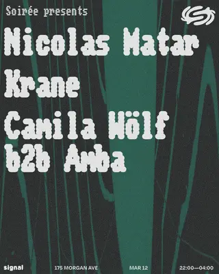 Soirée presents: Nicolas Matar, Krane and Camila Wölf b2b Amba on March 12, 2026 at Signal, New York features Nicolas Matar, Krane, Camila Wolf and Amba performing DJ sets.