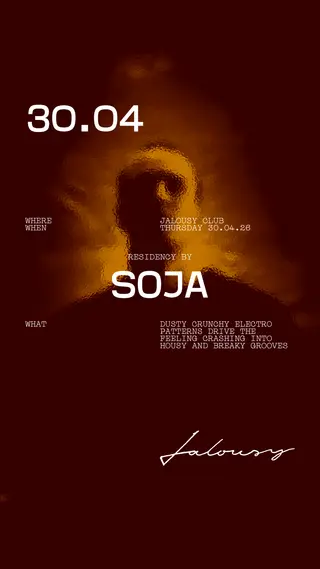 Soja takes place at Jalousy in Brussels, Belgium on April 30, 2026. Featuring Soja. House and Electro sounds all night.