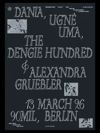 Somewhere Press x 90mil with Dania, Ugnė Uma, The Dengie Hundred & Alexandra Gruebler takes place at 90mil in Berlin, Germany on March 13, 2026. Featuring Ugnė Uma. Ambient and Experimental sounds all night.