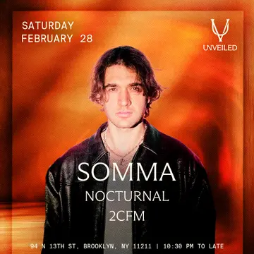 SOMMA at UNVEILED with Nocturnal and 2CFM takes place at Unveiled in New York City, Unknown on Saturday, February 28, 2026. Featuring SOMMA. House, Deep House.