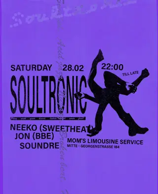 SOULTRONIC takes place at Mom's Limousine Service in Berlin, Germany on February 28, 2026. Featuring Neeko, Jon, Soundre. House sounds all night.