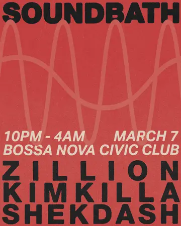 SOUNDBATH with shekdash + Zillion + KIMKILLA takes place at Bossa Nova Civic Club in New York, United States on Saturday, March 7, 2026. Featuring shekdash, Zillion, KIMKILLA.