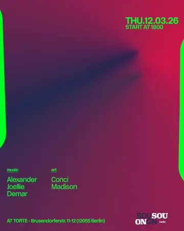 Set at TORTE BAR, SOUON 2026 brings together artists and fans in Berlin on Thursday, March 12, 2026. This event brings together artists and fans who share a passion for dance music culture and Dub, Latin Bass sounds.