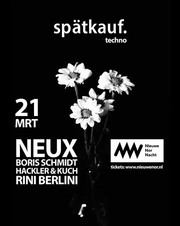 Spätkauf Nieuwe Nor w/NEUX takes place at Nieuwe Nor in All, Netherlands on Saturday, March 21, 2026. Featuring NEUX, Rini Berlini, Hackler & Kuch. Techno.