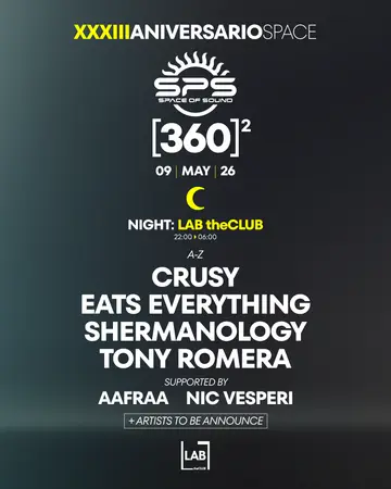 Space of Sound 33 ANIVERSARIO - THE 360 CLUB - [NIGHT] at LAB takes place at LAB theCLUB in Madrid, Spain on May 9, 2026. Featuring Crusy, Eats Everything, Shermanology, Tony Romera and 2 more. House.