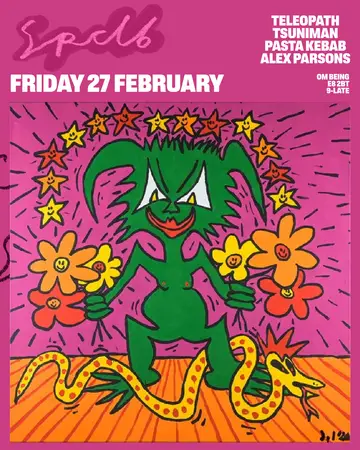 SPCLB takes place at Om Being in London, United Kingdom on Friday, February 27, 2026. Featuring TSUNIMAN, teleopath, Pasta Kebab, Alex Parsons. Techno, Bass.