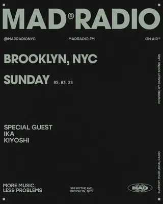SPECIAL GUEST, Kiyoshi, IKA takes place at MAD Radio NYC in New York on Sunday, May 3, 2026. Kiyoshi headlines the event. Full lineup and event details are listed on this profile.