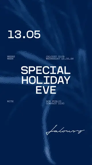 Special Holiday Eve takes place at Jalousy in Brussels, Belgium on May 13, 2026. Featuring Bon Public. House and Electro sounds all night.