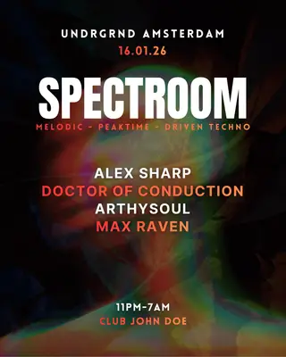 Spectroom x UNDRGRND takes place at John Doe in Amsterdam, Netherlands on January 16, 2026. Featuring Alex Sharp, Doctor of Conduction. Techno sounds all night.