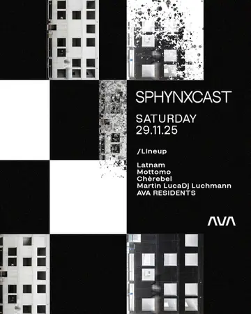 SPHYNXCAST takes place at AVA Club in Berlin, Germany on Saturday, November 29, 2025. Featuring Latnam, Mottomo.