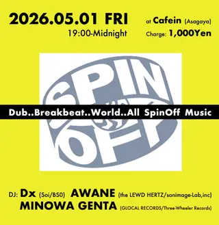 SPIN OFF takes place at Cafein in Tokyo, Japan on May 1, 2026. Featuring Dx. Techno and Dub sounds all night.