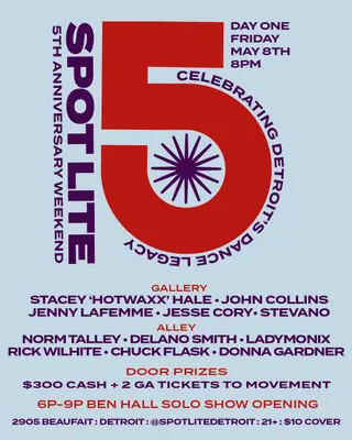SPOT LITE 5TH ANNIVERSARY WEEKEND on May 8, 2026 at Spot Lite Detroit, Detroit features Stacey Hotwaxx Hale, Jesse Cory, Stevano, Norm Talley, Delano Smith, LADYMONIX, Donna Gardner, Rick Wilhite, dej.y, Ryan Spencer, Scott Zacharias, Ladylike, Savannah G and Aboudi Issa performing DJ sets.