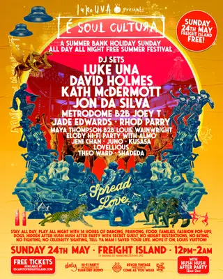 Spring Summer Series: È Soul Cultura on May 24, 2026 at Freight Island, Manchester features Luke Una, David Holmes, Metrodome, Joey T, Jade Edwards and Rhod Parry performing house DJ sets.