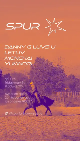 SPUR V4 - house, garage & breaks feat. danny g luvs u, letliv, monchai, yukinori takes place at Hyperion Social in Los Angeles, United States on May 8, 2026. Featuring DANNY G LUVS U, Monchai, yukinori. House and Garage sounds all night.