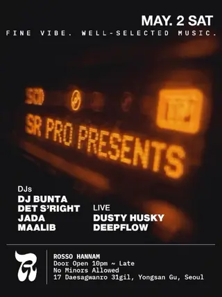 SR PRO PRESENTS at Rosso in Seoul on Saturday, May 2, 2026. JADA headlines the event. Full lineup and event details are listed on this profile.