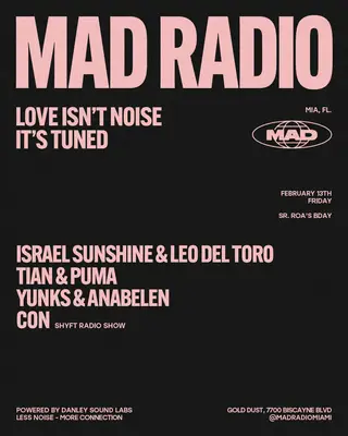 SR. ROA'S BDAY: Israel Sunshine & Leo Del Toro, TIAN & PUMA, YUNKS & ANABELEN on February 13, 2026 at Mad Radio Miami, Detroit features Israel Sunshine, Leo Del Toro, Tian. and Puma (US) performing house DJ sets.