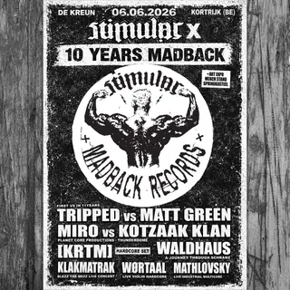 Stimular x 10 year Madback records takes place at De Kreun in Kortrijk, Belgium on June 6, 2026. Featuring Tripped, Miro Pajic, KRTM. Hardcore and Gabber sounds all night.