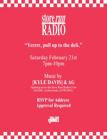 Store Run Radio - EPISODE 30+31 takes place at TBA - Store Run Radio in New York, United States on Saturday, February 21, 2026. Featuring [Kyle Davis], AG (1), NoahG, Grabba Ranks and 1 more. Club, Electronica.