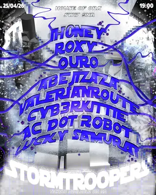 OURO and valerianroute headline Storm Troopers at TBA - House of Ora, London, United Kingdom on April 25, 2026. Featuring OURO, valerianroute, AC (dot robot). Expect Hardcore and Industrial throughout the night.