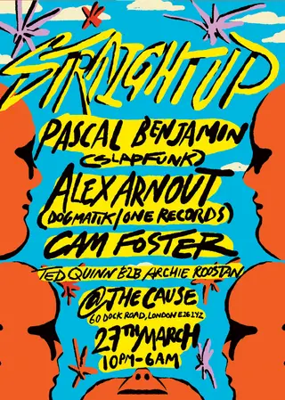 Straight Up Launch party takes place at The Cause in London, United Kingdom on March 27, 2026. Featuring Pascal Benjamin, Alex Arnout, Cam Foster. House and Garage sounds all night.