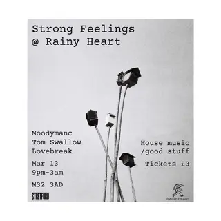 Strong feelings takes place at Rainy Heart in Paris, France on March 13, 2026. Featuring Moodymanc. Deep House and Balearic sounds all night.