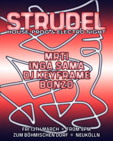 Strudel: House, Prog & Electro Night takes place at Zum Böhmischen Dorf in Berlin, Germany on Friday, March 13, 2026. Featuring Bonzo (2), DJ Keyframe, Inga Sama, MRTI. Progressive House, House.