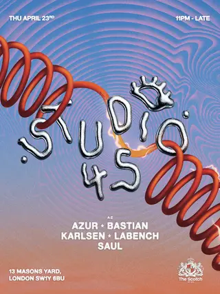 Studio 45 @ The Scotch of St James on April 23, 2026 at The Scotch, London features LABENCH, Saül (FR) and azur(FR) performing house DJ sets.