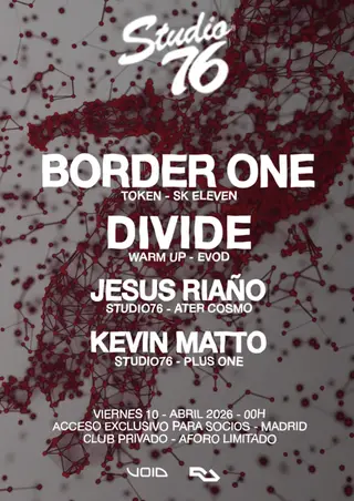 STUDIO76 present: Border One + DIVIDE takes place at TBA - Powered by: Void Acoustics in Madrid, Spain on April 10, 2026. Featuring Border One, Kevin Matto, Jesus Riaño. Techno and Dub Techno sounds all night.
