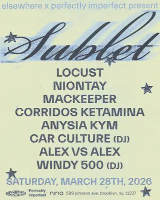 Sublet: Locust, Niontay, Mackeeper, Corridos Ketamina, Anysia Kym + more on March 28, 2026 at Elsewhere, New York City features electronic music performances DJ sets.