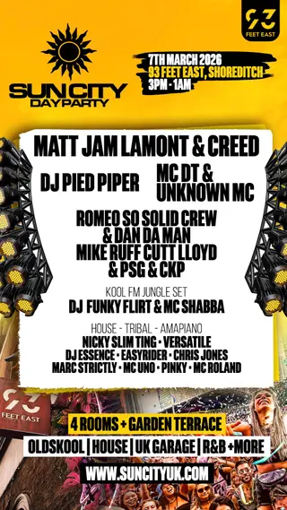 SUN CITY DAY PARTY takes place at 93 Feet East in London, United Kingdom on March 7, 2026. Featuring Matt Jam Lamont, MC Creed, Pied Piper, MC DT and 1 more.