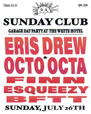 Sunday Club - Eris Drew & Octo Octa, Finn, Esqueezy & BFTT takes place at The White Hotel in Manchester, United Kingdom on July 26, 2026. Featuring Eris Drew, Octo Octa, Finn, Esqueezy and 1 more. House and Garage sounds all night.