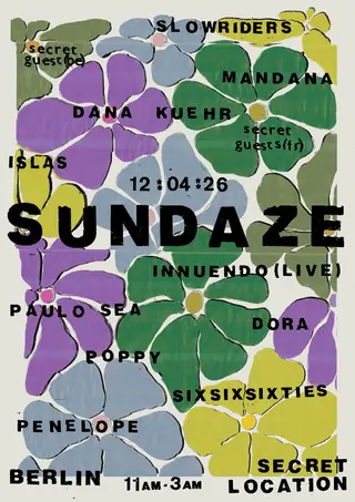 Sundaze goes to Berlin on April 12, 2026 at TBA, Berlin features Dana Kuehr, Innuendo, Islas, Mandana, Paulo Sea, Penelope (2), Poppy (BE) and Sixsixsixties performing house DJ sets.