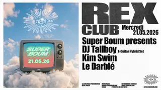 Super Boum presents: DJ Tallboy E-Guitar Hybrid Set, KIM SWIM, Le Darblé on May 21, 2026 at Rex Club, Paris features DJ Tallboy and KIM SWIM performing techno DJ sets.