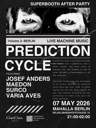Superbooth Afterparty - PREDICTION CYCLE by CiaoCiao takes place at MaHalla in Berlin, Germany on May 7, 2026. Featuring MAEDON, SURCO, Varia Aves. Pure techno sounds.