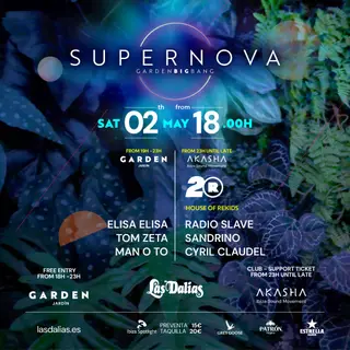 SUPERNOVA x House of Rekids takes place at Akasha Las Dalias Club in Ibiza, Spain, on May 2, 2026. The lineup features Radio Slave, a techno producer and DJ known for his work on the Rekids label. Sandrino, a German artist, brings his distinctive blend of house and techno to the event. Elisa Elisa, recognized for her deep house sounds, adds to the diverse lineup, while Tom Zeta, known for his melodic techno style, rounds out the performance roster. The event showcases techno and house genres.