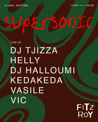 SUPERSONIC at Fitzroy on May 31, 2026 at Fitzroy, Berlin features DJ Tjizza, Helly, Vasile, Vic (FR), DJ Halloumi and kedakeda performing house DJ sets.
