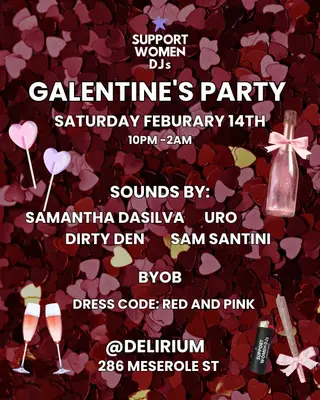 Support Women DJs Galentine's Party takes place at Delirium in New York, United States on February 14, 2026. Featuring Samantha DaSilva. House and Pop sounds all night.